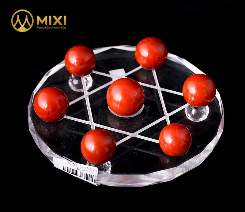 Bộ Thất Tinh Ngọc Bích Jasper Đỏ_Nhỏ được chế tác từ Ngọc bích Jasper hay còn gọi là đĩa thất tinh, đĩa ngọc thất tinh. Là 1 bộ gồm 7 quả cầu đá nhỏ bố trí trên mặt đĩa trận đồ. Với 6 viên đá được xếp trên một trận đồ bao quanh 1 viên đá lớn hơn tượng trưng cho ngôi sao David quyền năng – ngôi sao có 6 đỉnh nhọn là sự kết hợp vận dụng các yếu tố hình học sẽ tạo nên cũng như khuếch tán những năng lượng tốt, điều hòa dòng khí, tạo sự hòa thuận và khả năng bảo hộ chủ nhân.