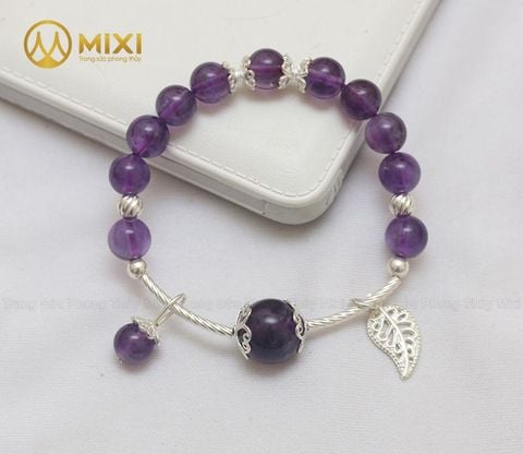 Vòng Tay Đá Thạch Anh Tím 2A 8 Ly Mix Charm Lá Treo Bạc 999 món quà phong thủy May Mắn, Cát Tường dành cho mệnh Hỏa, mệnh Thổ.